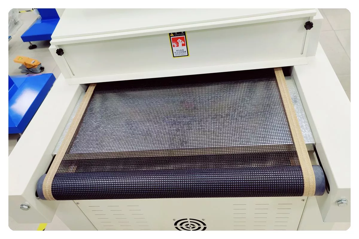 A correia transportadora da máquina de cura UV com transportador de largura de 1000 mm é controlada por um motor elétrico e sua velocidade pode ser ajustada com base na velocidade de produção necessária para atender às diferentes demandas de secagem.
