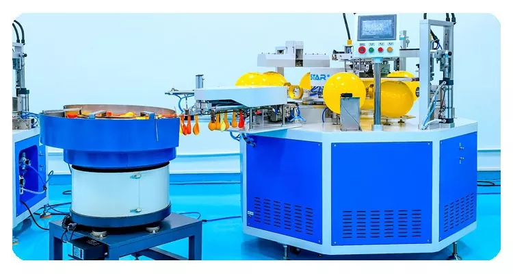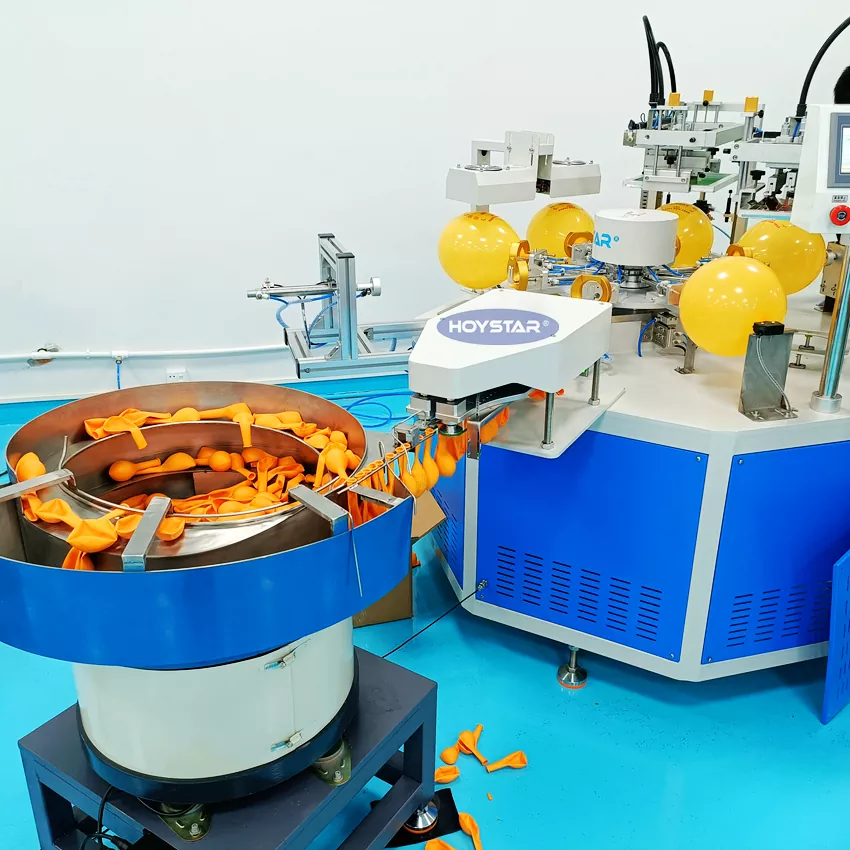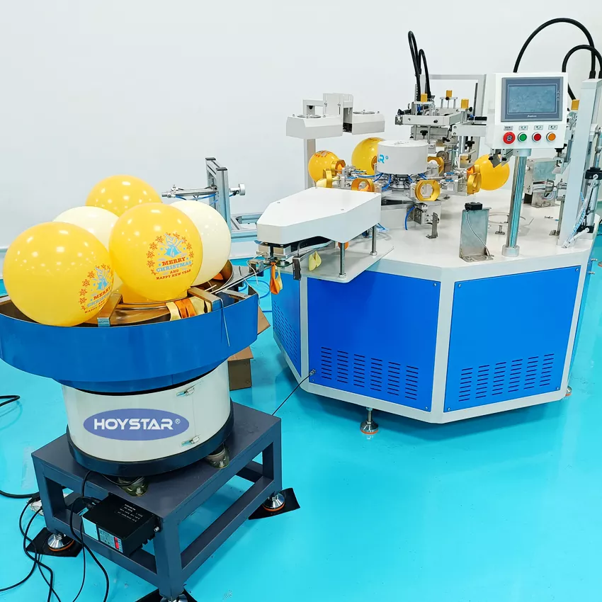 HOYSTAR é um fabricante e fornecedor confiável na China; Esta máquina de serigrafia de balões de 2 cores HOYSTAR com alimentador automático foi projetada para impressão em balões de látex. Equipado com mesa de trabalho rotativa, carregamento automático, sopro automático, rotação automática, secagem automática, funções de descarga automática. Controle por tela de toque PLC, interface amigável para operação segura e intuitiva. A máquina combina velocidade, precisão e facilidade de uso.