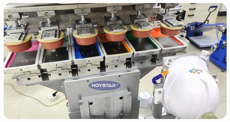Como fabricante e fornecedor profissional na China, Máquina de impressão de almofada para capacete de segurança de 6 cores HOYSTAR equipada com painel de controle com tela de toque PLC fácil de operar. Esta máquina foi projetada para imprimir em superfícies curvas e irregulares, como capacetes. Esta máquina versátil é ideal para uma variedade de indústrias, incluindo equipamentos de segurança e proteção, equipamentos esportivos, peças automotivas, itens promocionais, caixas eletrônicas e brinquedos. E tem altura de mesa ajustável para acomodar várias dimensões do produto.