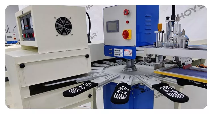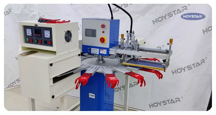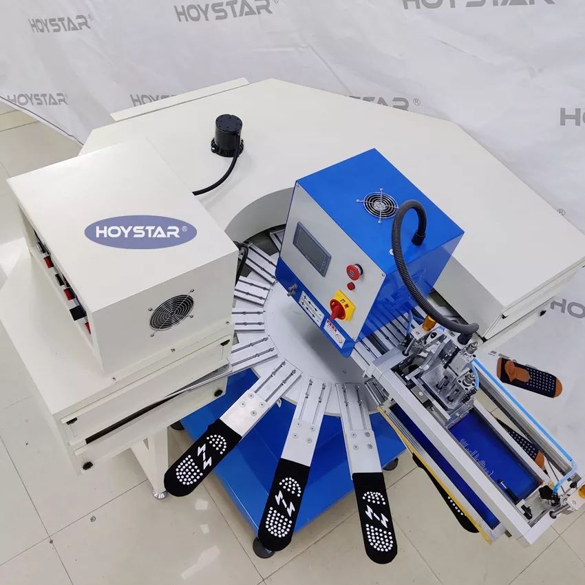 Como fabricante e fornecedor profissional, esta máquina de serigrafia para meias de tamanho grande e alta velocidade HOYSTAR foi projetada para aplicações na indústria de tricô têxtil. Com uma velocidade de até 1200PCS/Hr, é adequado para imprimir meias antiderrapantes, meias de bebê, meias adultas, meias de futebol, etc. Equipado com mesa de trabalho rotativa e 16 estações de trabalho, é muito conveniente para carregar e descarregar meias. Controle de tela de toque PLC, muito fácil de operar. Máquina equipada com sistema de secagem pode secar bem o silicone e a tinta.