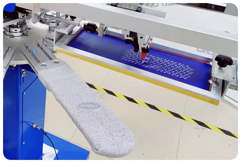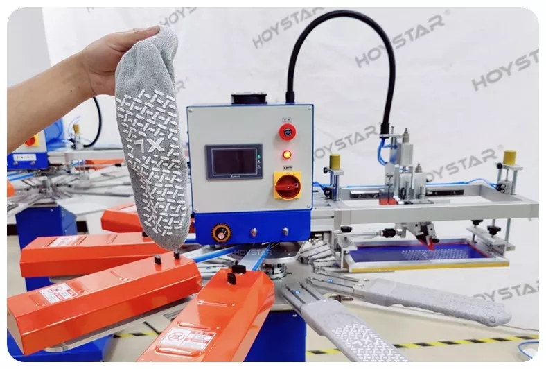 Como fabricante profissional na China, gostaríamos de fornecer a você uma máquina de serigrafia para meias HOYSTAR de alta velocidade. Nossas máquinas adotam controle PLC e tela sensível ao toque e são usadas principalmente para imprimir vários tipos de meias. A máquina pode imprimir na sola e no salto das meias e está equipada com forno de secagem que pode secar bem o silicone e a tinta.