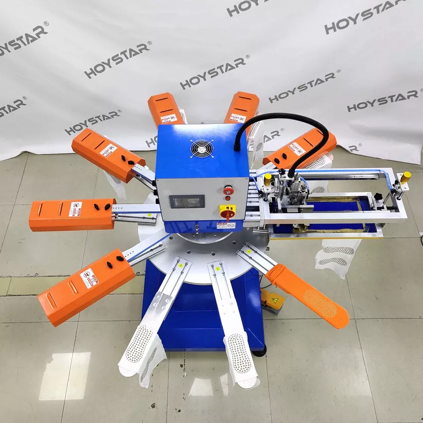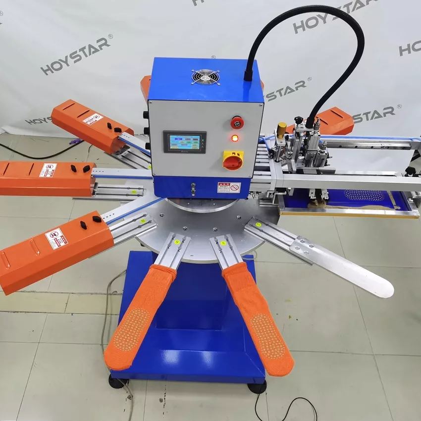 Como fabricante e fornecedor profissional, a máquina de serigrafia de alta velocidade HOYSTAR para meias foi projetada para aplicações na indústria de tricô têxtil. Com uma velocidade de até 1000PCS/Hr, é adequado para imprimir meias antiderrapantes, meias de bebê, meias adultas, meias de futebol, etc. Equipado com mesa de trabalho rotativa, é muito conveniente para carregar e descarregar meias. Controle de tela de toque PLC, muito fácil de operar. Máquina equipada com sistema de secagem pode secar bem o silicone e a tinta.