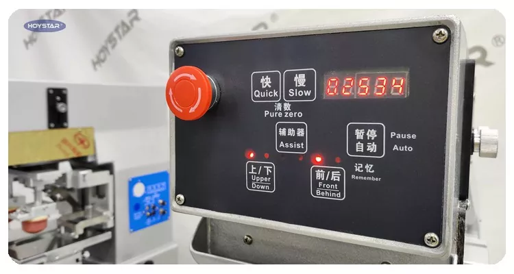 A máquina de tampografia de mesa rotativa de duas cores com IC SCM (microcomputador de chip único) programa a sequência de ação. Com os modos semiautomático e automático, os operadores podem adaptar-se às diferentes necessidades de produção.